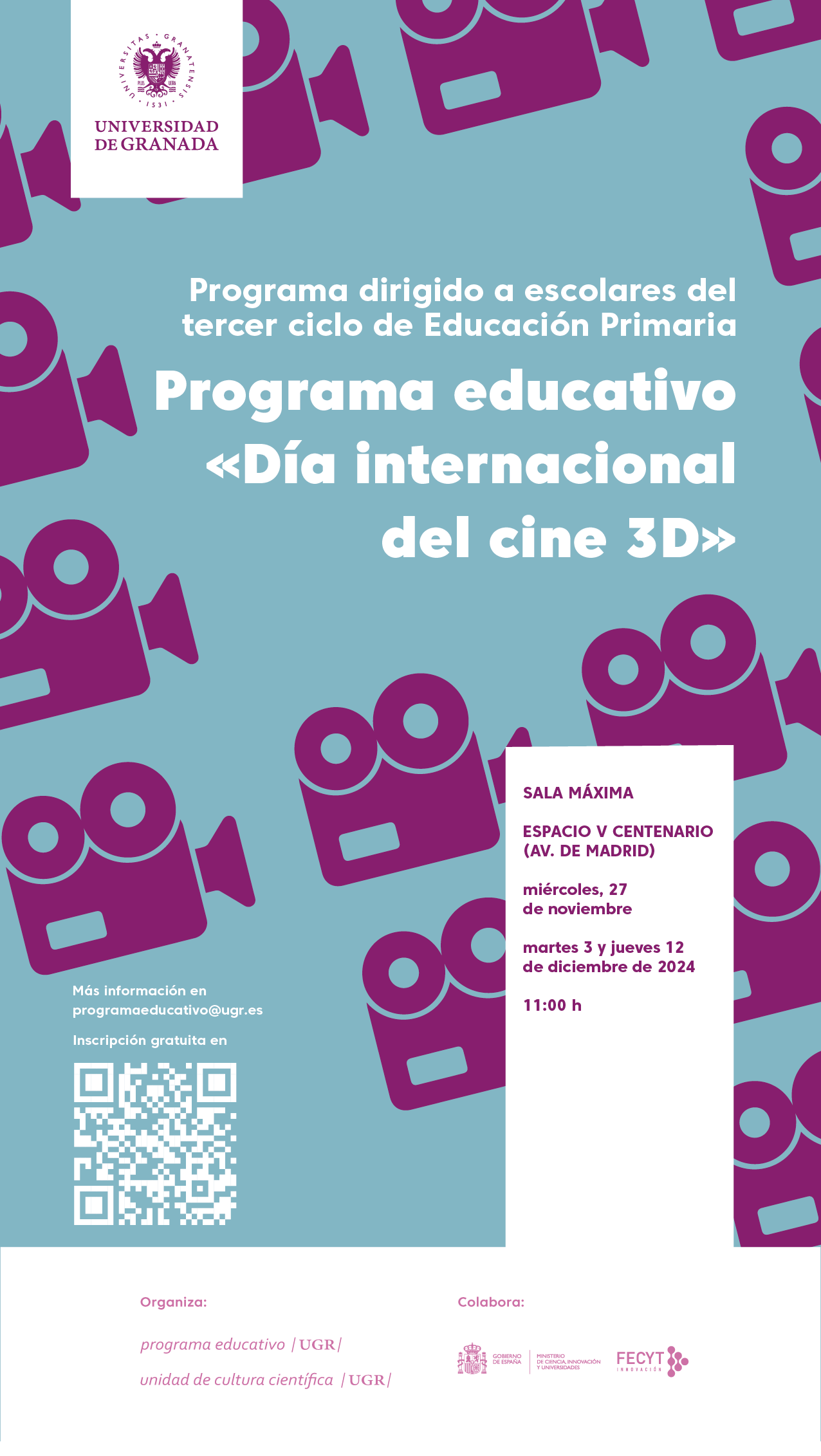 Participa en la celebración que vamos a llevar a cabo en el marco Día Internacional del Cine en 3D, un evento especialmente diseñado para acercar a los escolares de Educación Primaria al fascinante mundo de la tecnología tridimensional en el cine. Este programa de talleres creativos nos permitirá generar imágenes tridimensionales, ofreciéndonos la oportunidad de comprender la evolución y el impacto de las tecnologías audiovisuales en las industrias de la cultura y el entretenimiento. Para participar en este programa educativo dirigido a centros educativos es necesario que el profesorado interesado formule una solicitud a través de formulario web: