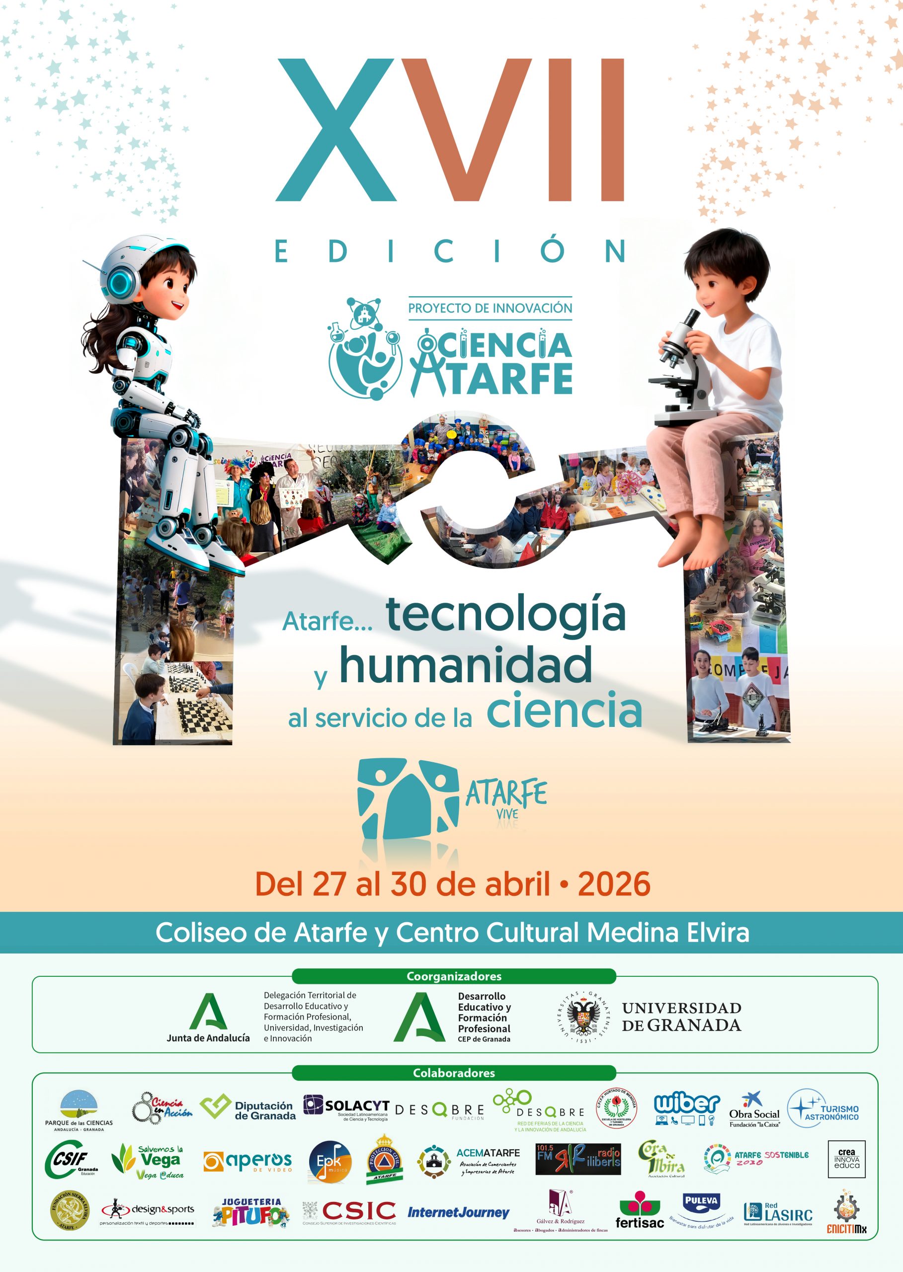 Durante los próximos 28 y 29 de abril de 2026 se celebrará una nueva edición de la Feria de la Ciencia de Atarfe, que tendrá lugar en el Coliseo de Atarfe.